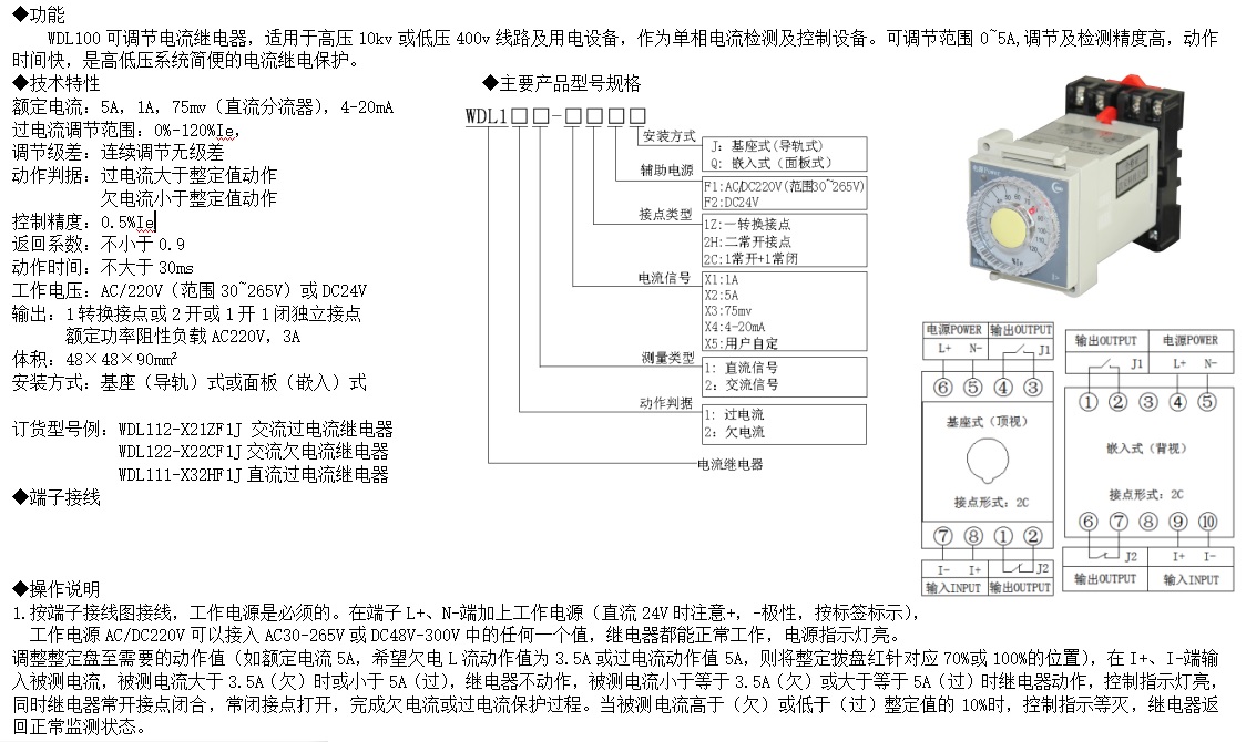 WDL100可調(diào)節(jié)電流繼電器,適用于高壓10kv或低壓400v線路及用電設(shè)備,作為單相電流檢測及控制設(shè)備??烧{(diào)節(jié)范圍0~5A,調(diào)節(jié)及檢測精度高,動作時間快,是高低壓系統(tǒng)簡便可靠的電流繼電保護(hù)。