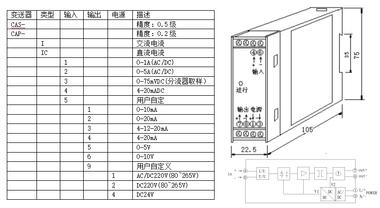 CAS系列電量變送器是將被測交直流電流、電壓等信號轉(zhuǎn)換成按線性比例輸出直流電流、電壓并隔離的設備。