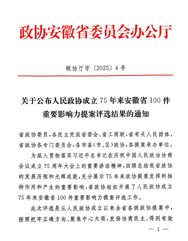 凡濤政協(xié)提案榮獲人民政協(xié)成立75年來安徽省100件重要影響力提案