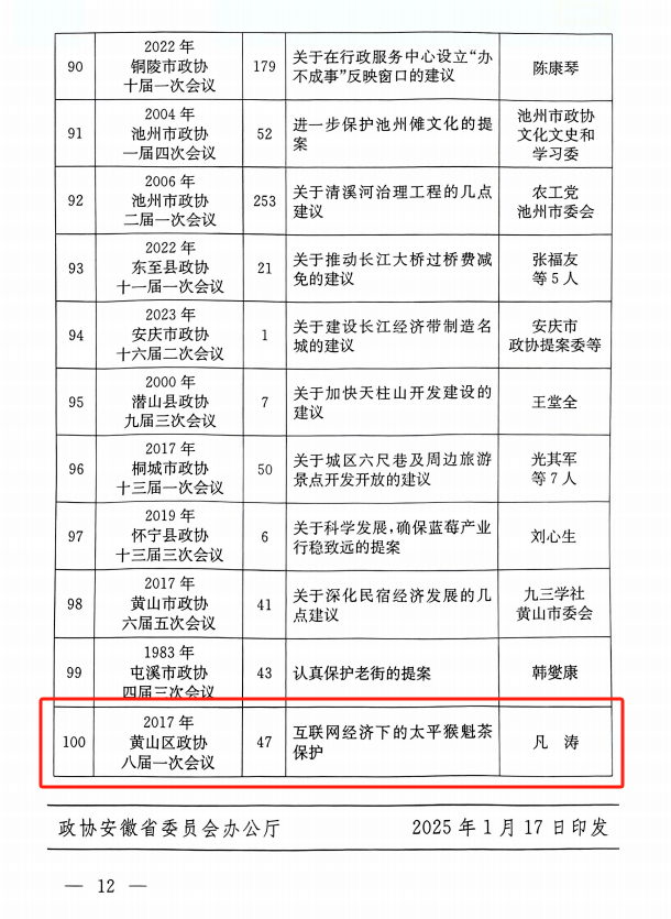 人民政協(xié)成立75年來安徽省100件具有重要影響力提案的評選結(jié)果揭曉。黃山六百里猴魁茶業(yè)股份有限公司董事長凡濤提出的《互聯(lián)網(wǎng)經(jīng)濟下的太平猴魁茶保護》提案名列其中。此次評選出的《淮河水利提案》等100件重要影響力提案,其中,省政協(xié)提案50件、省轄市政協(xié)提案34件、縣(市、區(qū))政協(xié)提案16件。這些提案為推動各個歷史時期我省經(jīng)濟社會發(fā)展發(fā)揮了重要作用,產(chǎn)生了重要影響。