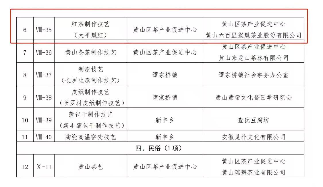 近日,黃山區(qū)人民政府正式公布第六批區(qū)級非物質(zhì)文化遺產(chǎn)代表性項(xiàng)目名錄,"紅茶制作技藝(太平魁紅)"成功入選。該技藝由黃山區(qū)茶產(chǎn)業(yè)促進(jìn)中心申報,黃山六百里猴魁茶業(yè)股份有限公司作為保護(hù)單位參與傳承保護(hù)工作。